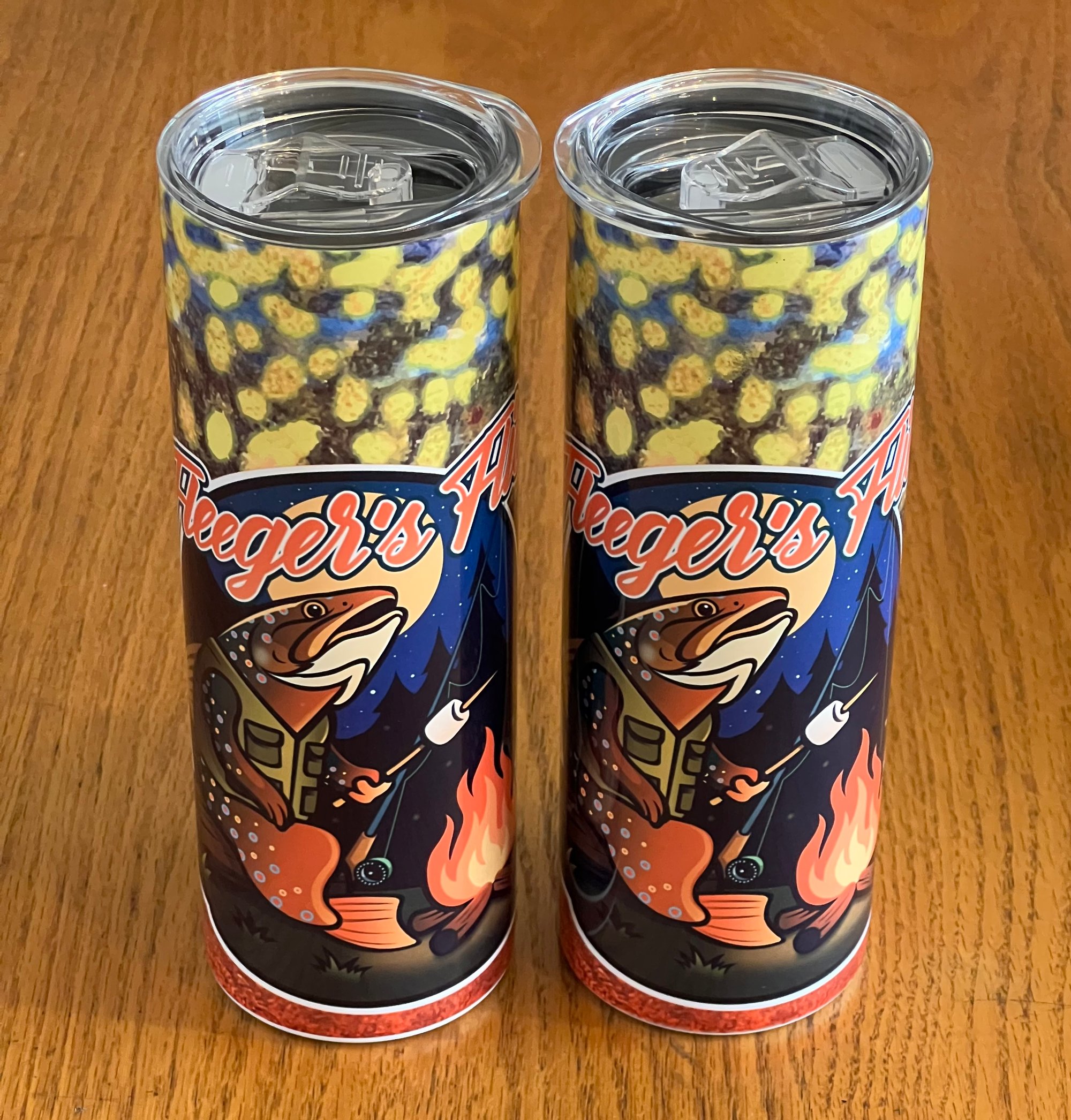 These 20 oz tumblers feature a bold, detailed brook trout skin pattern wrapped around the cup and finished with the Fleeger’s Flies Campfire Brookie logo—built for anglers who appreciate the backcountry and everything that comes with it.