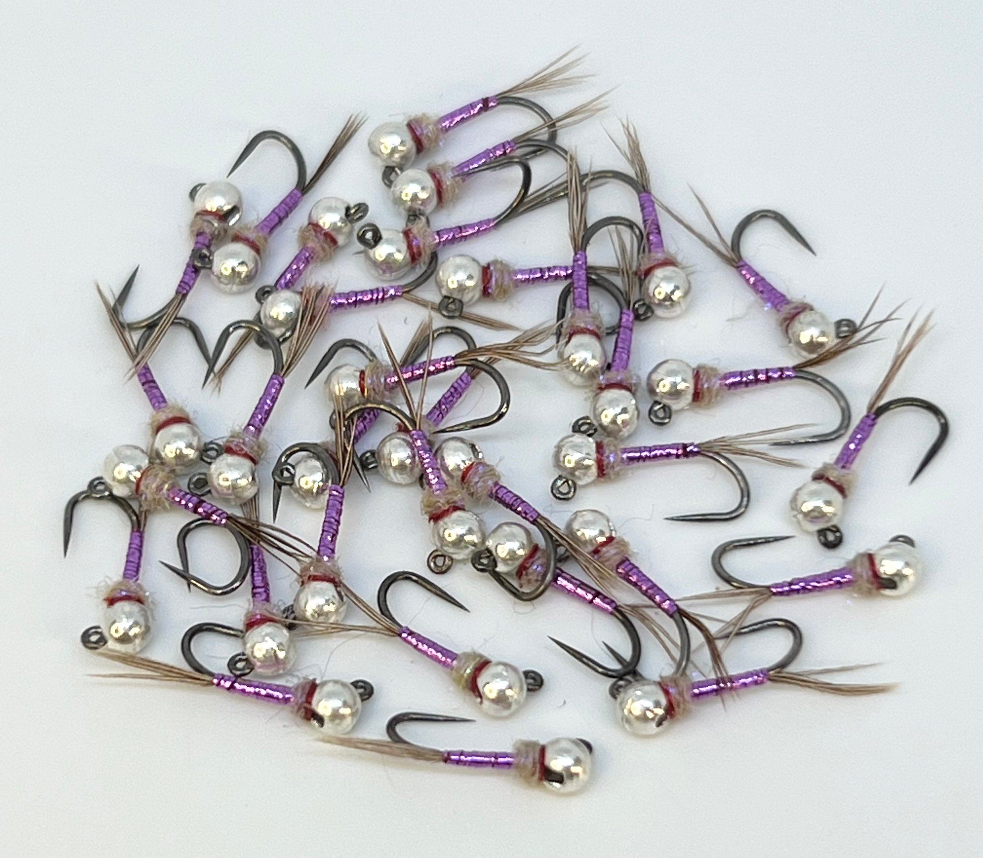 The Rainbow Warrior originally tied by Lance Egan is a staple fly pattern for any river or spring creek. This Purple version is a surefire winner! The Purple Warrior is a great all around searching pattern that will equally fit in as a Mayfly nymph or a larger Midge.